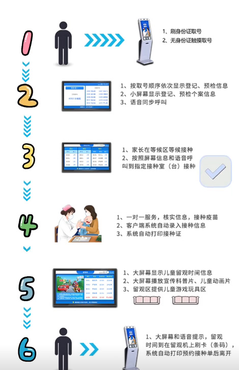 第一步,預防接種的叫號機刷身份證取號無身份證觸摸取號兩種方式。第六步,大屏幕名字顯示和語音呼叫,留觀時間到了后再機器上刷卡后系統自動打印預約接種單就可以離開。