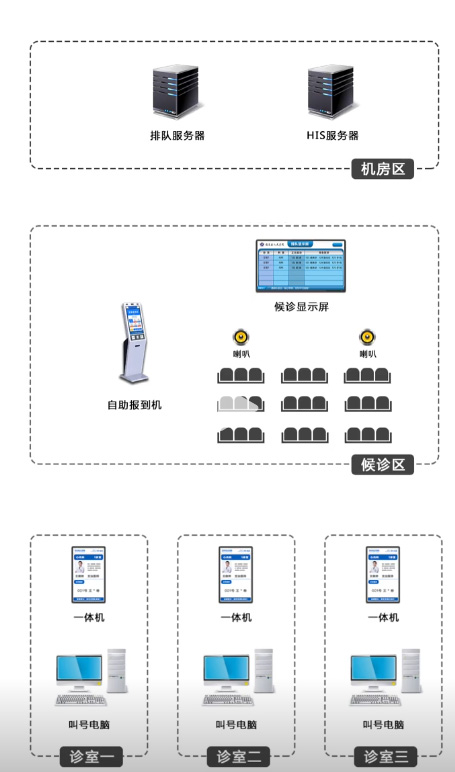 排隊叫號系統圖,機房區由排隊服務器和叫號服務器組成。候診區由自助報道一體機,播放喇叭候診顯示屏組成。診室區由排隊叫號顯示一體機和呼叫電腦組成,同時服務器顯示屏叫號一體機都是通過tcp聯網。
