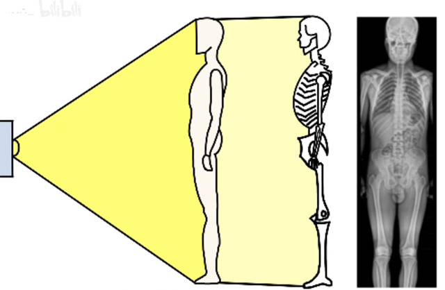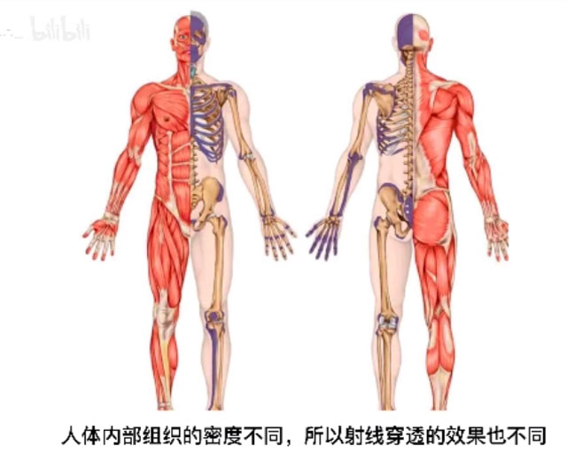 有時候有點咳嗽,需要使用DR拍片檢查。病人需要躺到DR檢查床上面,影像所見:兩肺中下野內中帶(墜積部位)可見肺紋影增多、增粗、模糊。病變部位小葉實變并存多發散在斑片狀高密度影,密度不均。影像診斷:考慮間質性肺炎?請結合臨床。接下來我們來簡單的理解DR的拍攝原理。X射線的特殊屬性是穿透性。DR就是利用了這個特殊屬性。人體內部組織的密度不同,所以射線穿透的效果也不同。比如肺被穿透后,因為它沒有阻擋,在X線片上就是黑的,膠片能夠全部曝光,所以呈現出來是黑的。骨骼肋骨不容易穿透,所以它顯示出來就是白的。